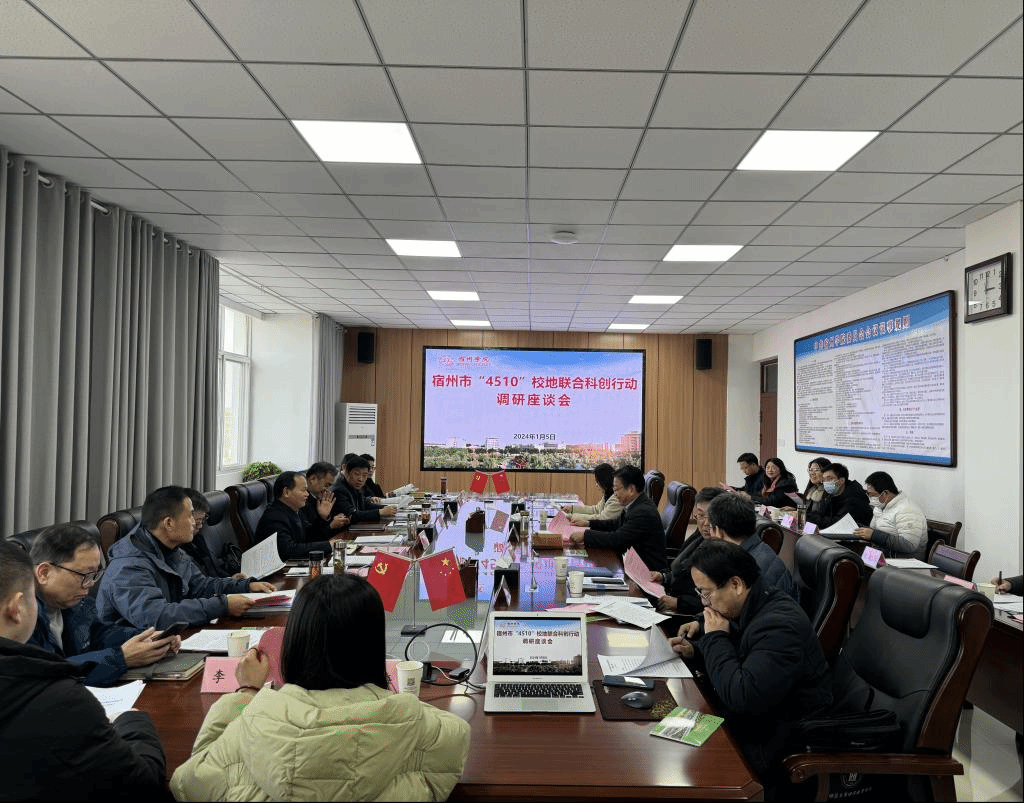 1月5日下午,宿州市“4510”校地联合科创行动调研座谈会议在宿州学院教育园区校区逸夫楼A504举行。宿州学院党委委员、副校长杨维志参加并主持会议。市委政研室、市经信局、市人社局、市科技局、市发改委,宿州学院有关二级学院和部门负责人,企业代表等参加了会议。