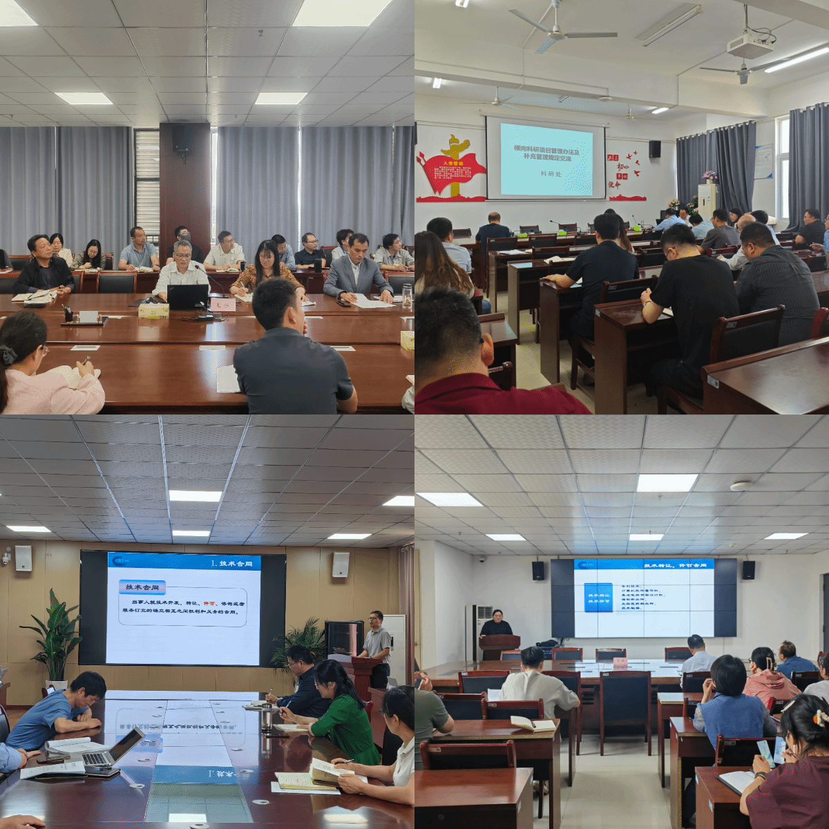 活动中,科研处人员对《中华人民共和国民法典》及相关规定对技术合同的类型与其定义进行说明,并对技术合同认定登记注意事项、技术合同存在的问题逐一进行分析;对于非技术合同,无效合同等不予登记等情况进行了解读。重点解释说明了横向科研项目管理的工作流程,如合同签署、合同备案、项目立项、支出经费、项目结项、绩效提取等过程。二级学院教师对相关内容提出了问题和建议,科研处人员进行了详细的解释和说明。