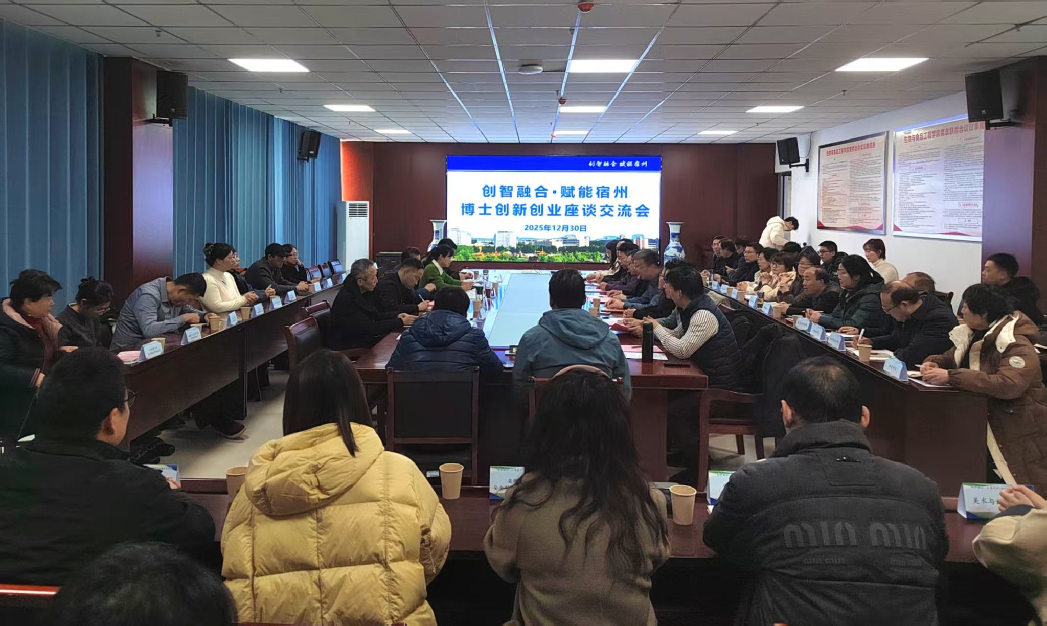 为深入贯彻落实创新驱动发展战略,进一步深化校地协同创新与人才交流合作,搭建高层次科技人才对接交流平台。12月30日下午,我校联合市科技局、市委人才工作局、市高层次科技人才协会等单位共同举办“创智融合,赋能宿州”——2025年宿州市博士创新创业座谈交流活动,活动在我校教育园区校区实训楼A1107会议室举行。我校副校长陈得宝,市科技局党组书记、局长李晓晖,市相关部门负责人,我校科研处、人事处,就业与校地合作处和二级学院主要负责人,科技副总,博士代表,部分企业代表参加活动。