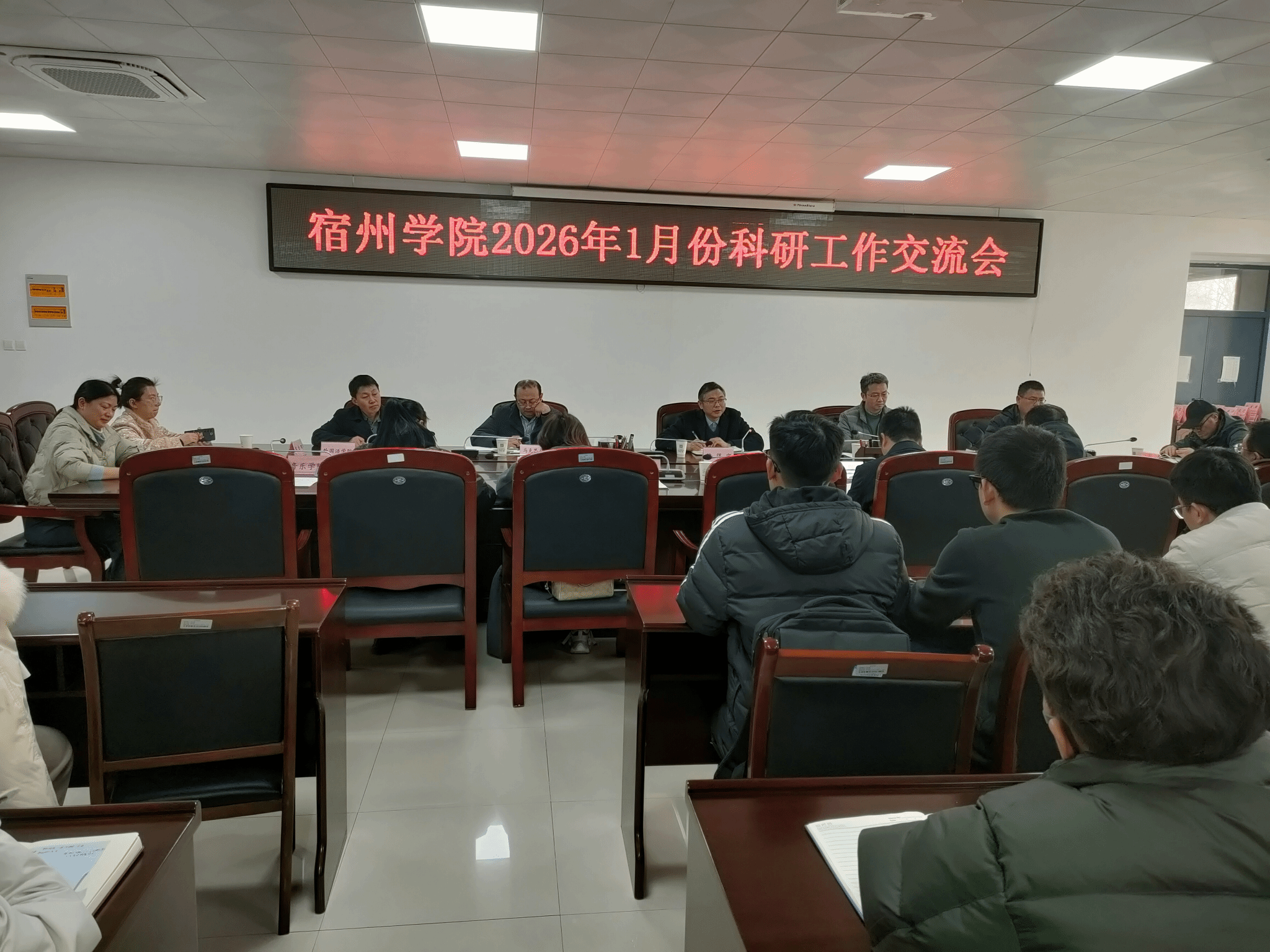 2026年1月16日下午,学校在逸夫楼第一会议室召开科研工作交流会。副校长陈得宝主持会议,各二级学院科研副院长和近三年引进的博士,及科研处相关人员参会。