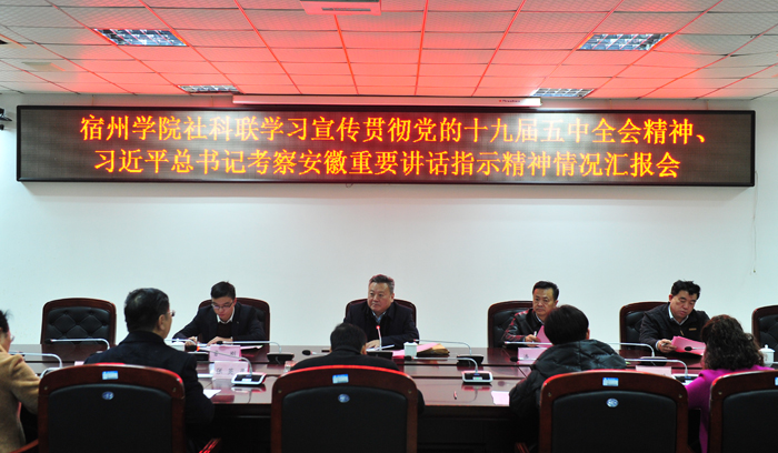 11月23日下午,省社科联党组书记、常务副主席洪永平一行来我校调研哲学社会科学工作。陪同调研的有省社科联办公室一级主任科员曹刚,宿州市委宣传部副部长潘甦,宿州市委讲师团团长曹振彪。校党委书记汪刘送,党委委员、副校长张英彦,宿州学院社科联委员代表、宣传部、科技处工作人员参加调研汇报会。